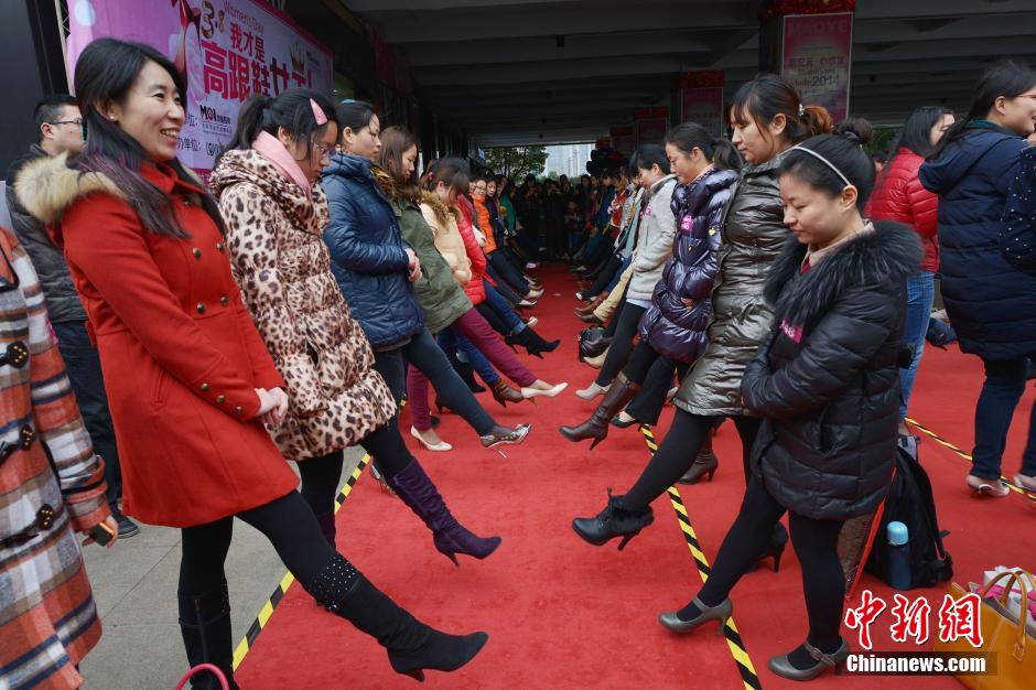 3月8日,无锡百余名女性穿着高跟鞋参加为“三八妇女节”特制的“高跟鞋女王”趣味比赛。前来参赛的选手必须穿上六公分以上的鞋子,以独脚站姿保持不动,坚持时间最久的选手即可晋级参加下一轮比赛,该赛以淘汰制角逐出“女王”。中新社发 李一芳 摄
