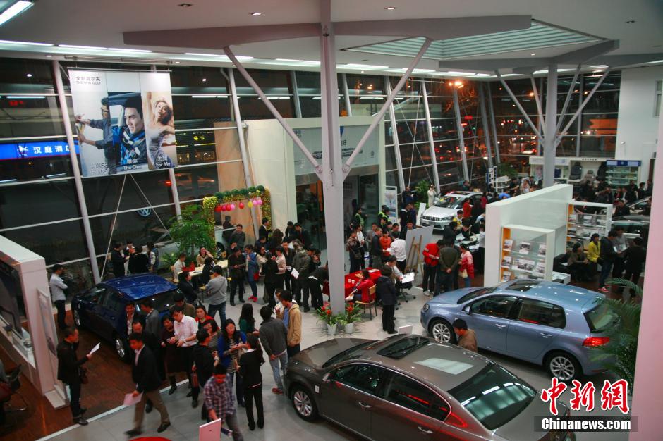 3月25日晚,杭州汽车“限牌”详情公布后,多家汽车4S店灯火通明地接待前来购买新车的市民。很多市民漏夜挑车,想赶在26日零时之前购买新车。中新社发 李晨韵 摄