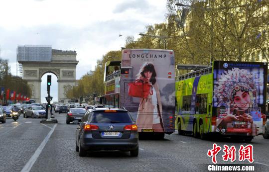 为迎接中国国家主席习近平3月25日对法国进行国事访问,近日,巴黎香榭丽舍大道道旁悬挂起了中法两国国旗。图为两辆分别绘有各具中法特色宣传广告的旅游观光巴士并肩驶向凯旋门。中新社发 龙剑武 摄