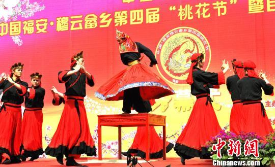 3月25日,中国福安·穆云畲乡第四届“桃花节”暨民俗文化活动展演在素有“世外桃源”之称的福建福安市穆云畲乡虎头村开幕。村中千亩桃花繁花似锦,花香袭人,吸引数千游客纷至沓来,看桃花、游乡村、赏民俗、戏清溪秀水。福安是全国畲族人口最多的县市,有6.8万畲族人口,境内畲族风情浓郁,当地千亩桃园所出产的“穆阳水蜜桃”被誉为“仙桃”、“闽东珍果”。图为畲族舞蹈《祈福·火头旺》亮相“桃花节”。吕巧琴 摄