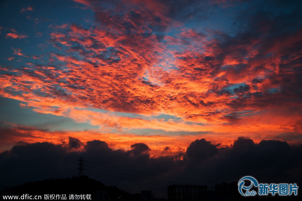 2014年5月13日,在连续的暴雨之后,当天傍晚深圳上空呈现出一片壮丽的晚霞,染红了西边的天空,美不胜收。(图片来源:东方IC)