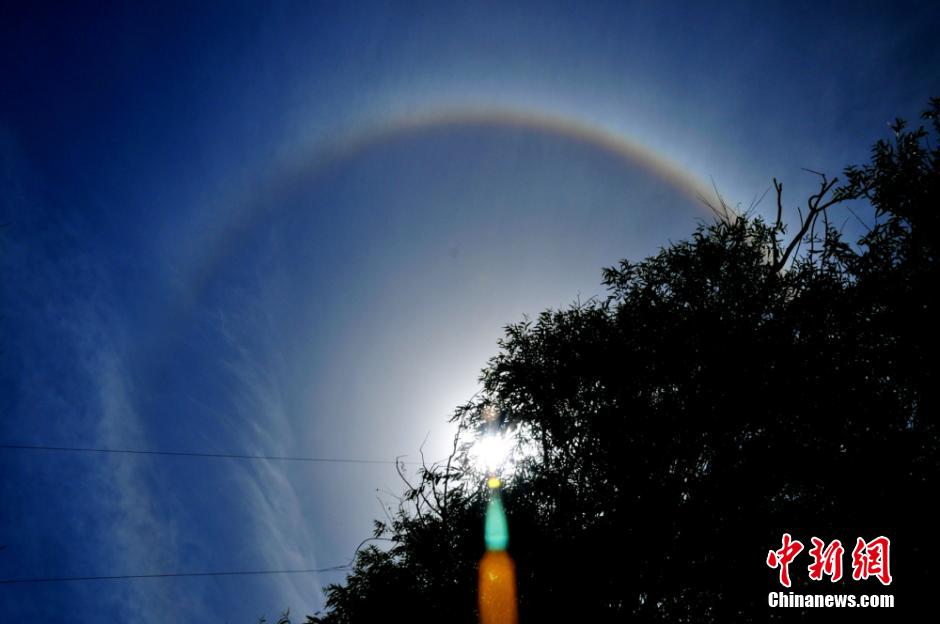 5月13日15时许,新疆阿拉尔市上空出现日晕奇观,拍摄时仔细观察还可发现太阳周围有一个巨大的光环,并且光环的颜色就像彩虹一般,时间持续了至少10分钟。出现日晕的前一天,阿拉尔市还是沙尘天气。日晕是一种大气光学现象,是日光通过卷层云时,受到冰晶的折射或反射而形成的。李向文 摄