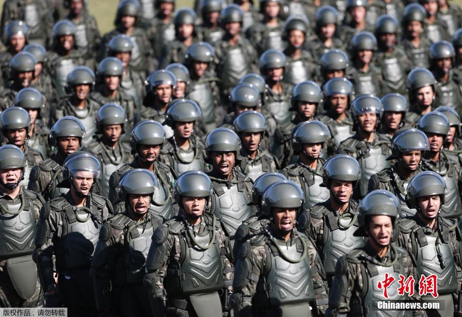 当地时间2014年5月12日,巴西里约,巴西军方承担世界杯安保工作的队伍正式亮相,整齐划一精神抖擞。