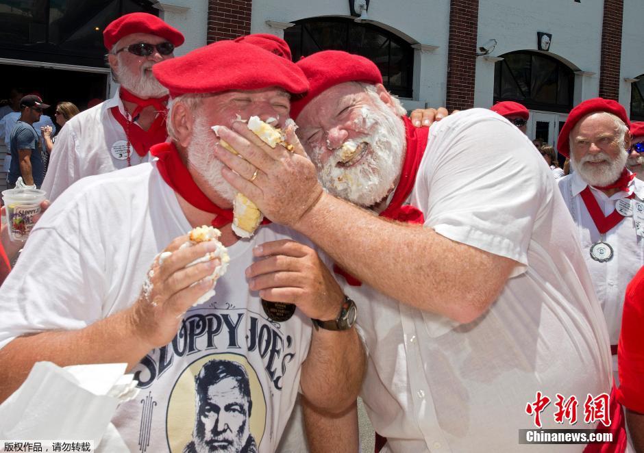 当地时间7月19日,在美国佛罗里达州海岛小城基韦斯特,海明威模仿大赛的参赛选手参加“奔牛”活动。海明威上世纪30年代曾居住过的佛罗里达州基韦斯特每年都会举办名为“海明威日”的系列纪念活动。其中最著名的就是海明威模仿大赛,评选模仿海明威衣着、神态最像的人。