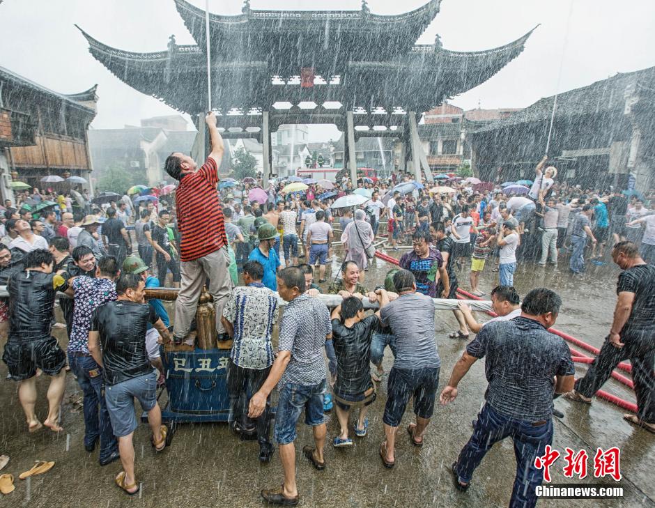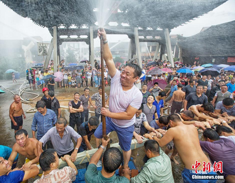 8月25日,农历八月初一,一年一度的“赛水龙”活动在有着“江南第一家”之称的浙江省浦江县郑宅镇举行,数条“水龙”在村民们的呐喊声中向天空喷射水柱。水龙,是中国古代流传下来的一种灭火工具,至今已有500多年历史,它靠杠杆两端的人工压力,使水流从特制的金属管中喷射出来灭火。每逢农历八月初一,郑宅人都要试试水龙,并且操练一下,逐渐发展成为一项传统的民俗活动。中新社发 高颖 摄