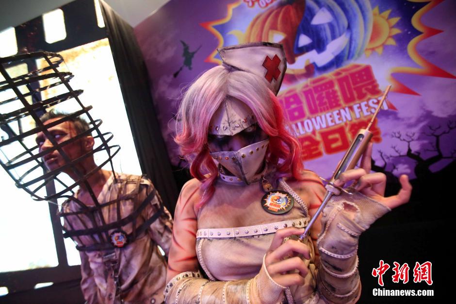 8月26日,香港海洋公园邀请传媒记者出席事先张扬的终极恐怖体验,为“万圣节哈啰喂全日祭”揭开序幕。广受大众欢迎的哈啰喂在今年加入终极恐怖鬼屋及多重革新刺激节目,力求让观众从“超级丧惊”玩到“惊喜狂笑”的双重体验。中新社发 洪少葵 摄