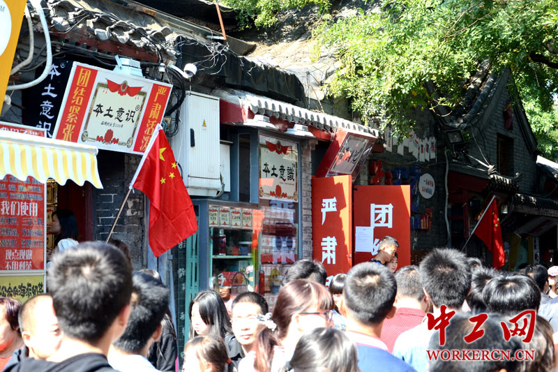 今年国庆长假期间,以老北京胡同文化为名片的南锣鼓巷吸引了全国各地的游客前往游玩,每天接待的游客数量在10余万人次,在10月2日更是突破了16万余人次,高峰时段每分钟就涌入280余人。图为10月6日,这段全长仅700余米的巷子挤满了全国各地的游客。 (中工网记者 笑语摄)