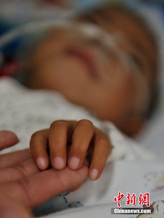 图为小女孩因严重营养不良体重仅有7公斤重,小手就像婴儿手。中新社发 刘忠俊 摄