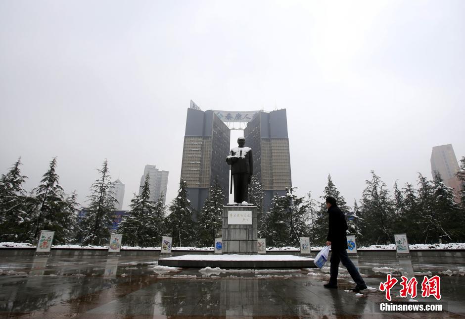 2月1日,武汉洪山广场董必武雕像被大雪覆盖。当日,武汉城区再次迎来新一轮降雪,整座城市被冬雪覆盖。中新社发 张畅 摄