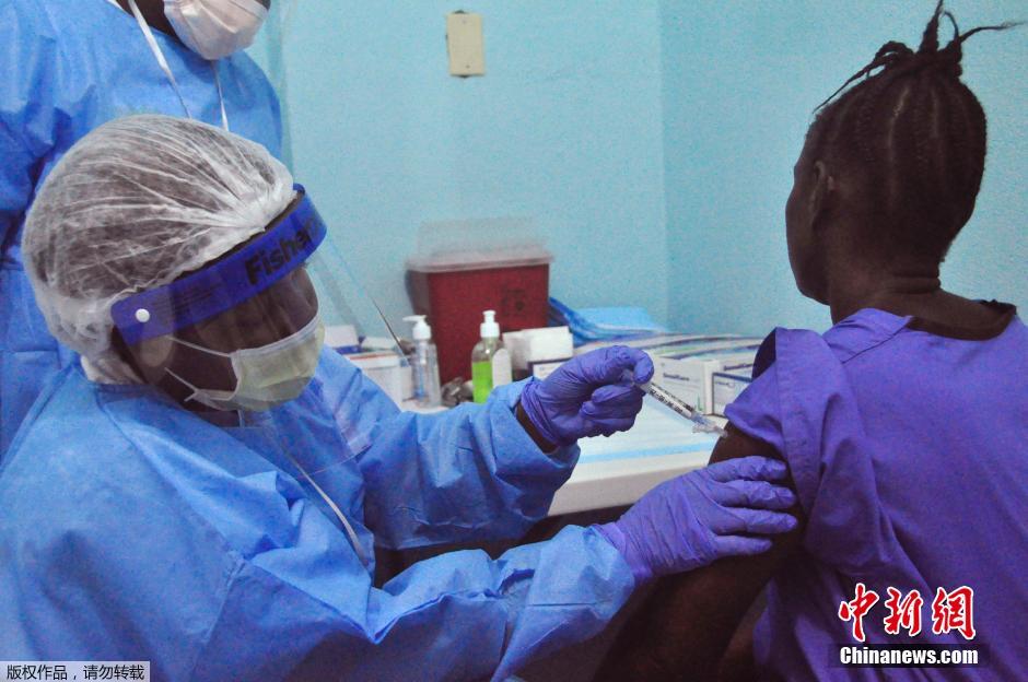 当地时间2015年2月2日,利比里亚蒙罗维亚,医护人员为民众注射埃博拉疫苗。埃博拉病毒疫苗将当日开始在利比里亚进行首次大规模试验。包括一线卫生工作者在内的近30000名志愿者接种该疫苗。