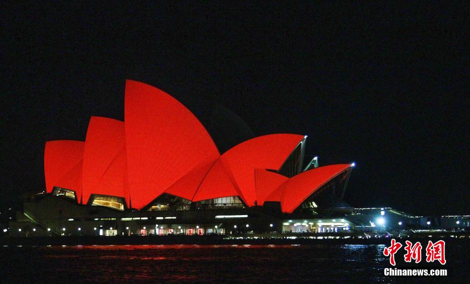 2月18日晚,悉尼歌剧院披上亮丽的“中国红”妆,庆祝中国羊年到来。中国驻悉尼总领馆、澳大利亚新州、澳洲中国和平统一促进会,以及澳各界、华人华侨的代表出席仪式。中新社发 姜长庚 摄