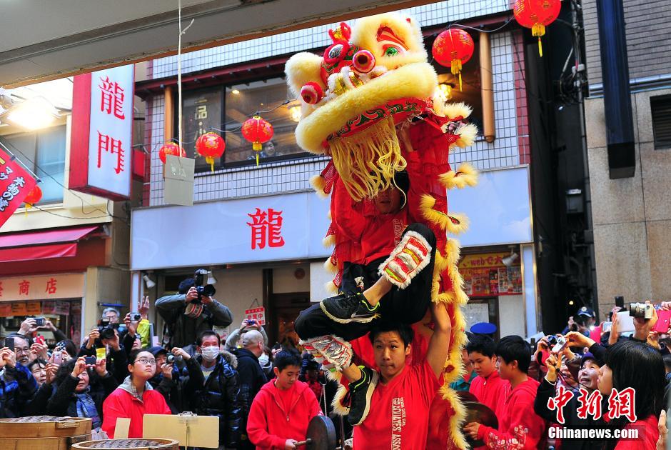 2015羊年春节大年初一的日本横滨中华街,传统的舞狮“采青”活动一路红火,家家店铺高悬红包迎候,并吸引众多游人围观。王健 摄