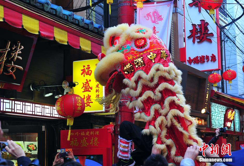 2015羊年春节大年初一的日本横滨中华街,传统的舞狮“采青”活动一路红火,家家店铺高悬红包迎候,并吸引众多游人围观。王健 摄