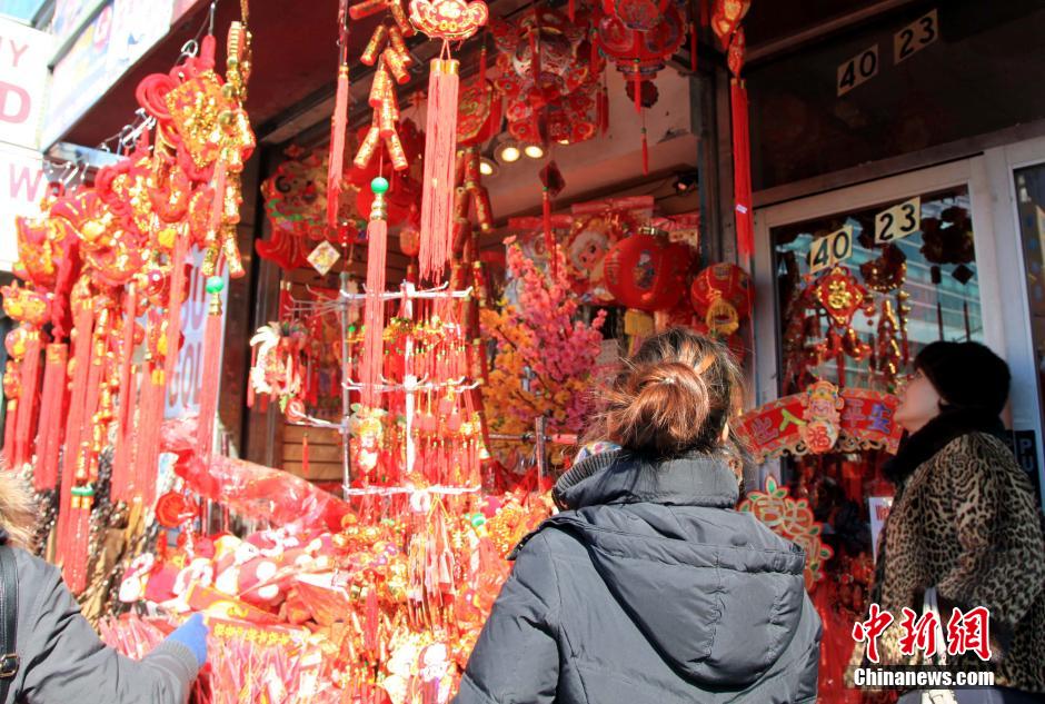 2015中国羊年春节来临之际,纽约华埠年味渐浓,当地华人忙着置办年货,一些经营年货的商埠生意兴隆。中新社发 阮煜琳 摄