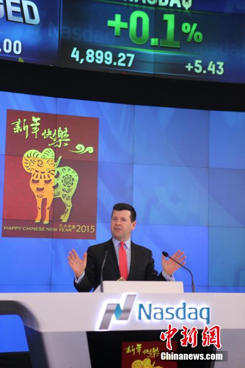 美国东部时间2月18日,中国驻纽约总领事章启月大使敲响纳斯达克开市钟,喜迎新年。图为纳斯达克副总裁麦柯奕以中文发出“新年快乐”、“恭喜发财”的祝福。中新社发 邓敏 摄