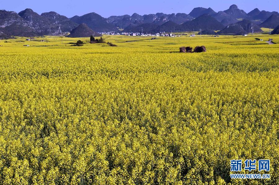 2月24日拍摄的盛开的油菜花田。春节长假期间,云南省罗平县80余万亩油菜花竞相绽放,吸引了来此度假的数十万旅游者徜徉花海,观赏油菜花盛开的壮丽景象。新华社记者陈海宁摄