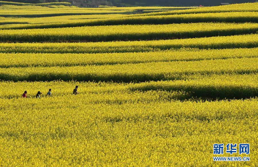 2月24日,游客穿行于油菜花海之中。春节长假期间,云南省罗平县80余万亩油菜花竞相绽放,吸引了来此度假的数十万旅游者徜徉花海,观赏油菜花盛开的壮丽景象。