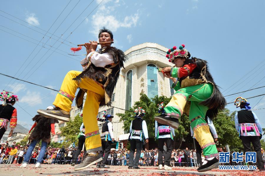 2月27日,文艺队在龙灯会上表演彝族打歌。当日是农历正月初九,云南大理彝乡南涧彝族自治县举行龙灯会。来自各乡镇的70多支表演队伍齐聚南涧镇,闹龙灯迎新春,祈愿新的一年风调雨顺、五谷丰登。新华社发(适志宏 摄)