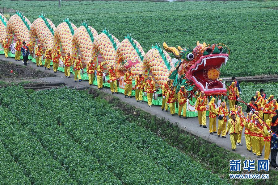 2月27日,巨龙穿行于浙江省瑞安市陶山镇的乡间小道。当日,浙江省瑞安市陶山镇桐浦社区举行“十八社拦垟福”民俗文化节巡游活动,68米巨龙和3000多名村民演员组成的巡游队伍一起闹新春,吸引上万群众参与。新华社发(苏巧将 摄)