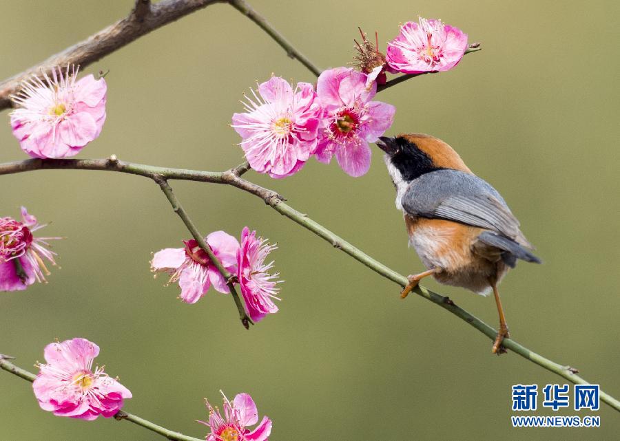 3月1日,在江苏省无锡市管社山庄,一只小鸟在盛开的梅花枝上嬉戏、觅食。新华社发(潘正光 摄)