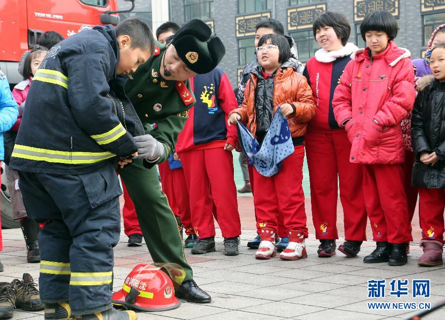 3月2日,在沈阳市沈河区朝阳街第一小学“开学第一课”消防安全宣传教育活动上,一名学生在消防战士指导下体验穿着消防战斗服。新华社发(黄金崑 摄)