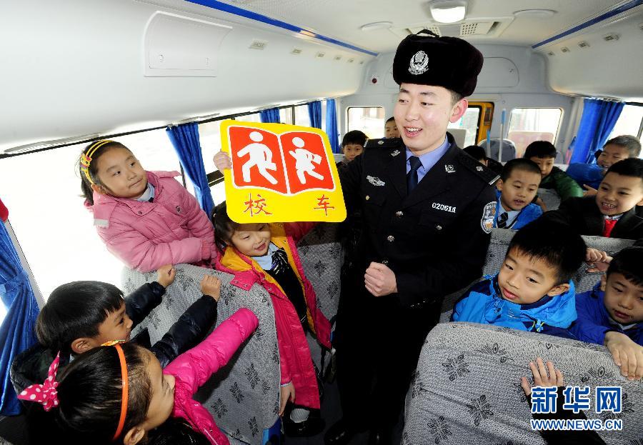3月2日,在沈阳市南京一校“开学第一课”上,一名交警指导小学生识别校车标识。新华社发(张文魁 摄)