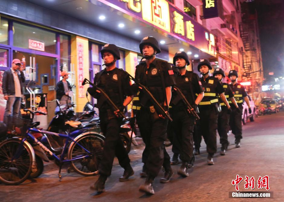 3月3日晚,海南省三亚市公安局特警(防暴)支队队员在三亚商品街武装巡逻。 中新社发 尹海明 摄
