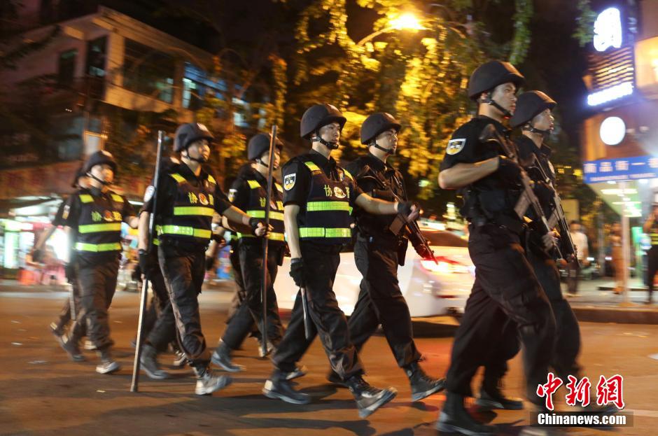 3月3日晚,海南省三亚市公安局特警(防暴)支队队员在三亚商品街武装巡逻。中新社发 尹海明 摄