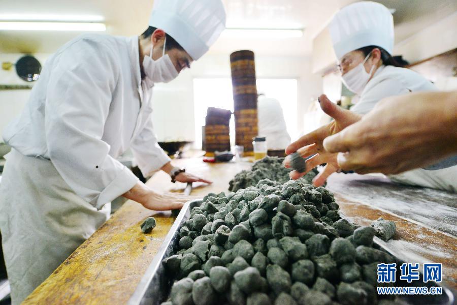 3月4日,在上海四川北路一老字号汤圆店内,面点师傅在制作芝麻馅料。元宵节临近,上海传统的手工汤圆受到市民们的追捧。面点师傅凌晨1点开始赶制汤圆,日平均销量达到5万只。 新华社发(沈春琛 摄)