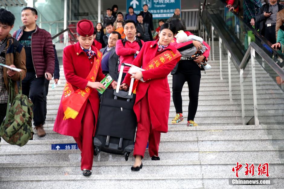 3月4日,福建铁路春运迎来节后返程客流高峰。3月5日是“学雷锋纪念日”,南昌铁路局福州客运段休班的动车乘务员姑娘们不顾春运带来的劳累,以实践雷锋精神为主题,来到福州火车站为返城旅客提供志愿服务,成为春运中一道靓丽风景线。李一明 摄