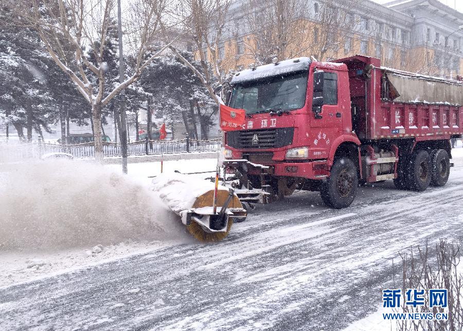 3月8日,清雪车在长春市街头清雪。当日,吉林省中南部地区出现强降雪,吉林、辽源、通化、白山、延边等地区还将出现大到暴雪天气。此次降雪给当地高速公路、机场通行等带来影响,市民出行需注意安全。新华社发(王薇 摄)