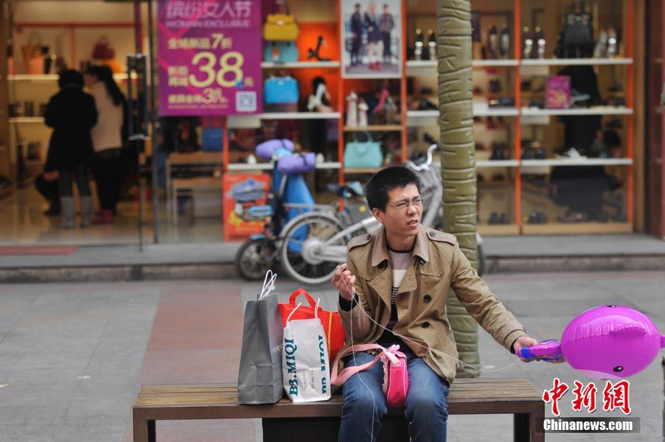 3月8日,在山西太原一家商场内,陪同女性“血拼”购物的男人们在一旁休息等待。当日是国际劳动妇女节,商家纷纷举办各种促销活动吸引女性前来购物,男性同胞往往唯女性意愿是从,全程拎包陪同。韦亮 摄