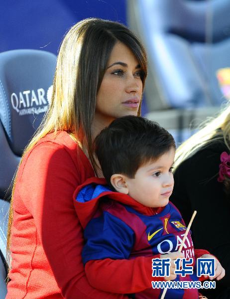 3月8日,巴塞罗那队球员梅西的女友安东内拉带着他们的儿子蒂亚戈(右)在场边。当日,在2014-2015赛季西班牙足球甲级联赛第26轮比赛中,巴塞罗那队主场以6比1战胜巴列卡诺队,从而反超皇家马德里队1分占据积分榜首位。新华社/美联