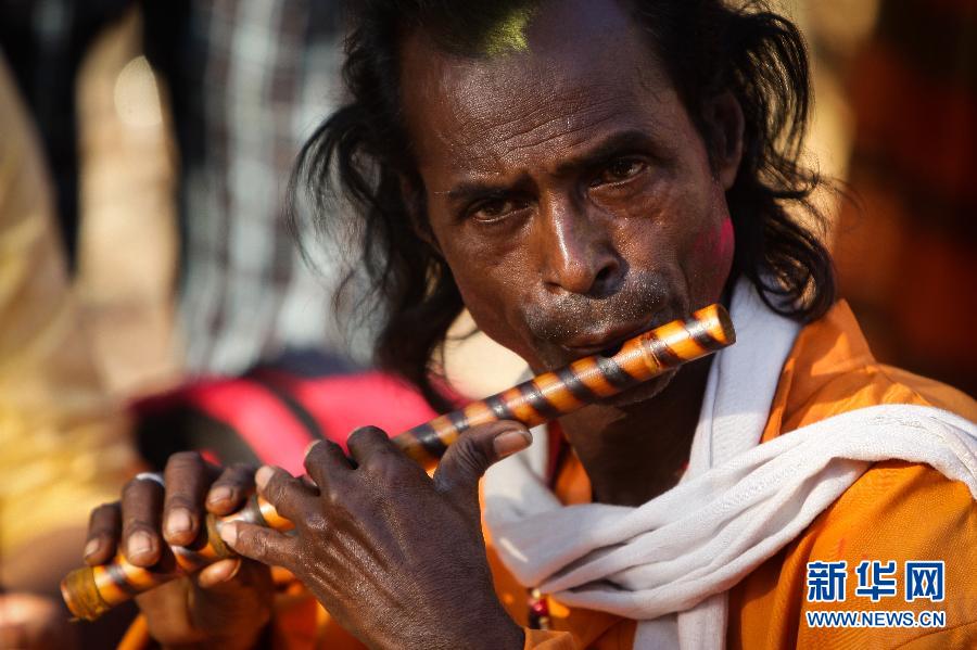 3月6日,一名“宝乌尔”在印度西孟加拉邦小城圣迪尼克坦附近的村庄集市上表演。