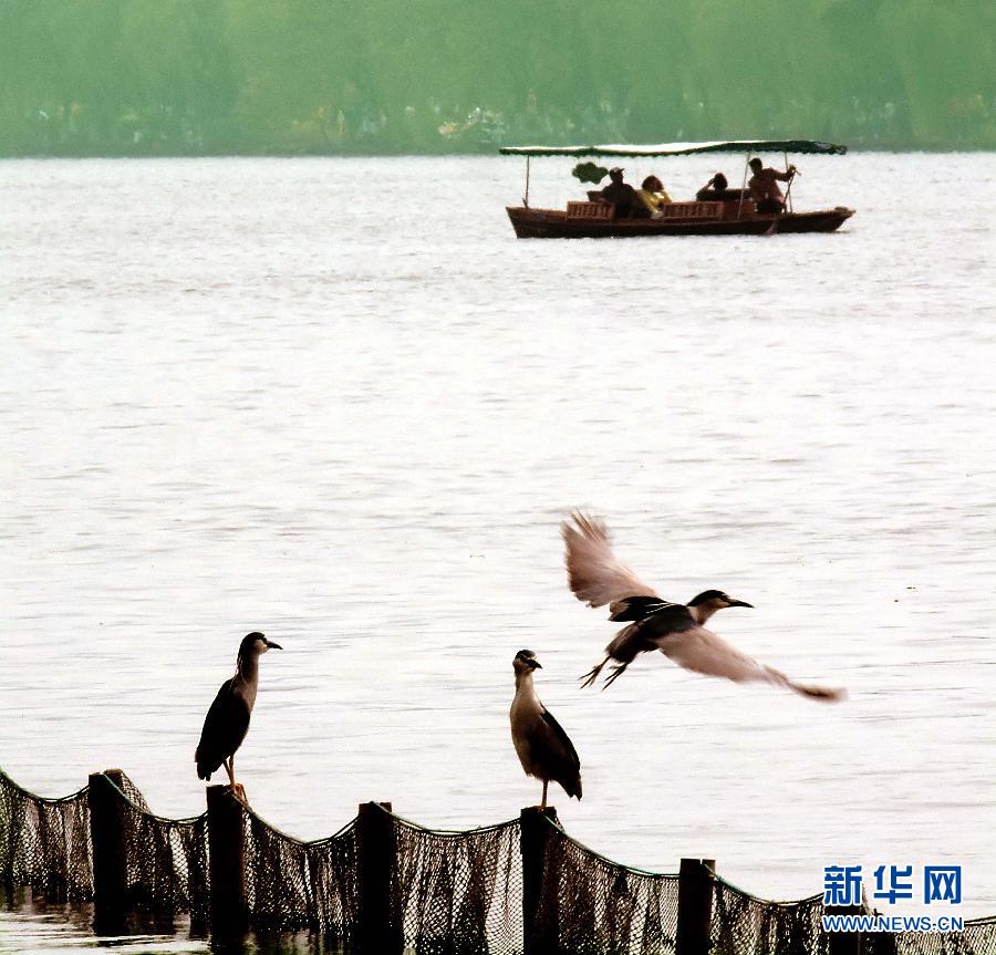 几只水鸟在西湖的湖面上栖息、觅食(2015年3月29日摄)。新华社记者 王颂 摄