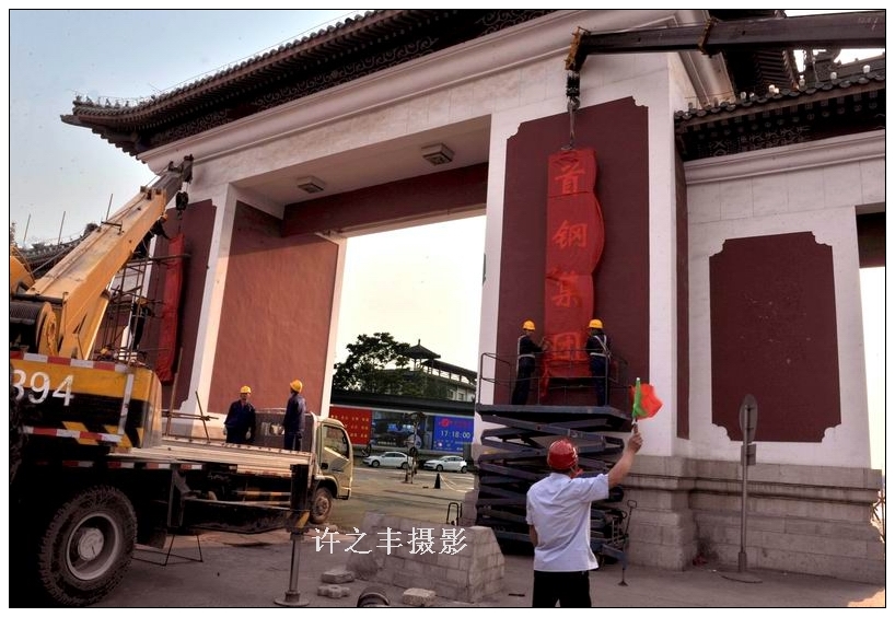 据首钢负责人称“为了配合长安街西延道路工程建设,预计18天内将首钢东大门全部拆完,这两块首钢集团和首钢总公司厂牌将永久保存在首钢博物馆。”这是最后首钢职工在厂牌前合影留念。工人日报-中工网记者许之丰摄影报道