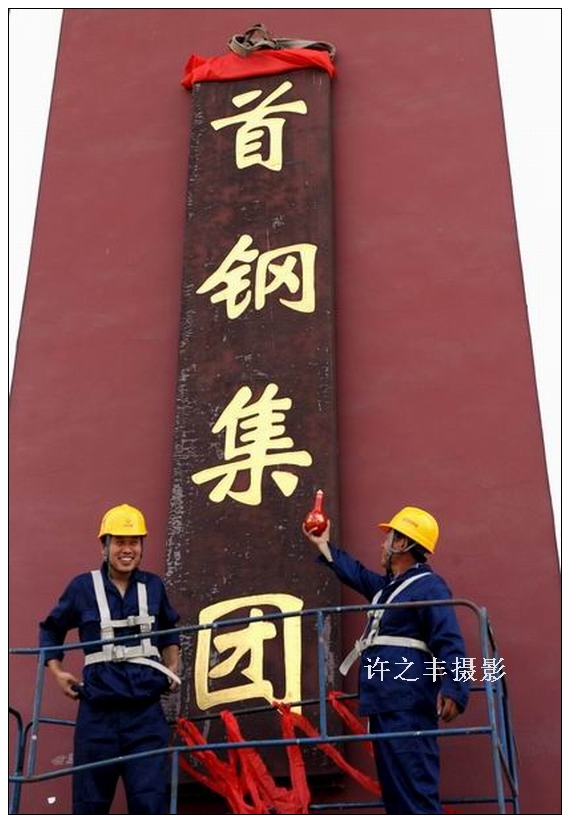 据首钢负责人称“为了配合长安街西延道路工程建设,预计18天内将首钢东大门全部拆完,这两块首钢集团和首钢总公司厂牌将永久保存在首钢博物馆。”这是最后首钢职工在厂牌前合影留念。工人日报-中工网记者许之丰摄影报道