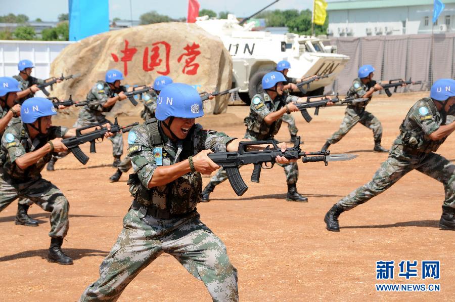 5月26日,在南苏丹中国维和步兵营营区,维和官兵在进行刺杀操表演。正在南苏丹执行维和任务的中国首支维和步兵营26日举行新营区启用仪式,标志着中国步兵营已正式完成部署,从准备阶段转入任务执行阶段。新华社记者李紫恒摄 图片来源:新华网