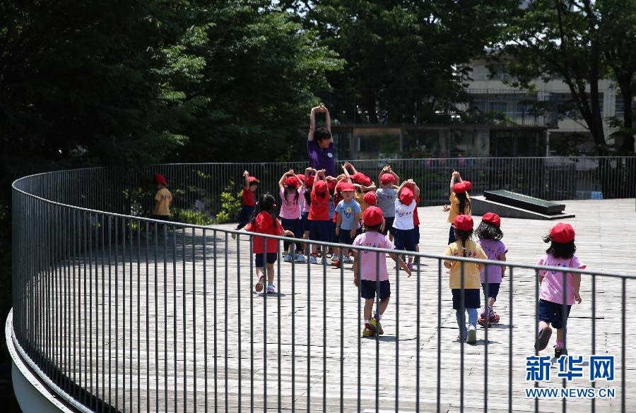 5月27日,在日本东京都立川市富士幼儿园,小朋友在屋顶上课。新华社记者刘天摄