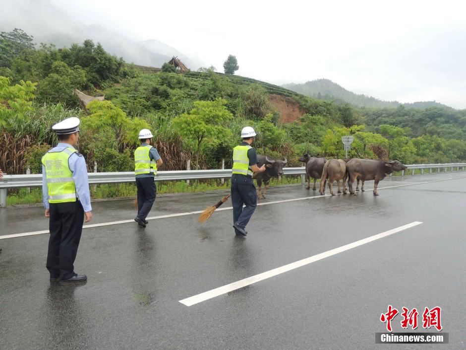 5月27日下午,在车辆飞驰的长深高速公路上(浙闽两个收费站中间),五头无绳牵绊的大水牛在高速公路上四处瞎晃,过往车辆纷纷避让,情形非常危险。接到报警后,浙江高速交警丽水五大队民警赶到现场,做起了跨省赶牛的“放牛娃”,将五头大水牛赶拢到一起,“后方警车预警,前方交警赶牛”的画面令过路驾驶员纷纷侧目。中新社发 胡丰盛 摄
