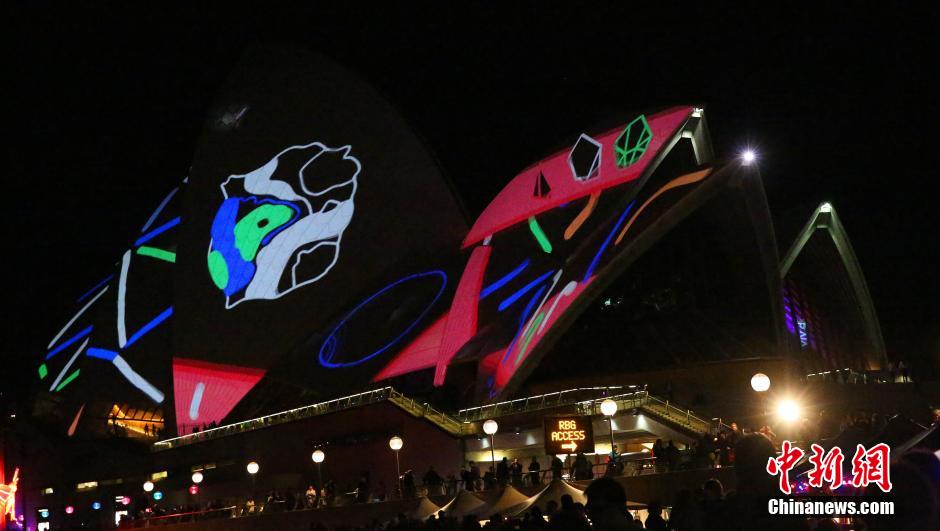 悉尼灯光艺术节5月27日继续进行。图为悉尼歌剧院在灯光秀中不断变幻梦境般的图案。此次灯光艺术节从本月22日正式开幕,将一直持续到下月8日结束。中新社发 赖海隆 摄