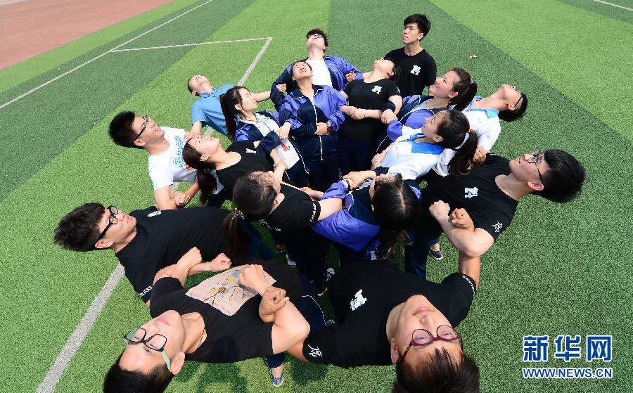 5月28日,河北省沧州市第三中学高三毕业班学生在操场通过互动游戏减压放松。 2015年高考临近,河北省沧州市第三中学采取多种“减压”方式,帮助学生释放紧张情绪,以平和、乐观心态迎接高考。 新华社记者 朱旭东 摄