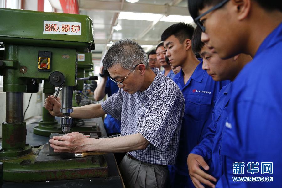 5月28日,“大国工匠”胡双钱在北京市工贸技师学院给学生现场辅导。当日,中华全国总工会组织《大国工匠》中的8位主人公来到北京市工贸技师学院,开展教学辅导与交流。《大国工匠》是央视近期推出的8集系列节目,讲述了8位不同岗位上的劳动者用他们的灵巧双手和匠心筑梦的故事。 新华社记者 殷刚 摄