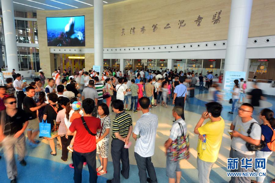 5月28日,市民在天津市第二儿童医院门诊大厅排队。当日,新建成的天津市第二儿童医院试开诊,有着六十多年历史的天津市儿童医院门急诊同时关闭,天津市新老儿童医院顺利“交班”。该院位于天津市北辰区,占地120亩,建筑面积15万平方米,规划设计年门急诊量255万人次,设有床位1200个,是集医疗、科研、康复、预防为一体的现代化大型儿童疾病治疗中心。新院启用后,天津市儿童医院将进行改扩建,预计2017年重新投入使用。届时天津市将拥有两个各有侧重的儿科综合性医院,进一步优化儿科医疗资源配置布局。新华社发(周勤隆 摄)