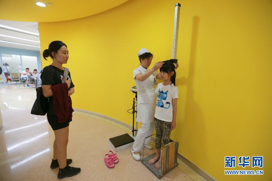 5月28日,一名女孩在天津市第二儿童医院测量身高。当日,新建成的天津市第二儿童医院试开诊,有着六十多年历史的天津市儿童医院门急诊同时关闭,天津市新老儿童医院顺利“交班”。该院位于天津市北辰区,占地120亩,建筑面积15万平方米,规划设计年门急诊量255万人次,设有床位1200个,是集医疗、科研、康复、预防为一体的现代化大型儿童疾病治疗中心。新院启用后,天津市儿童医院将进行改扩建,预计2017年重新投入使用。届时天津市将拥有两个各有侧重的儿科综合性医院,进一步优化儿科医疗资源配置布局。新华社发