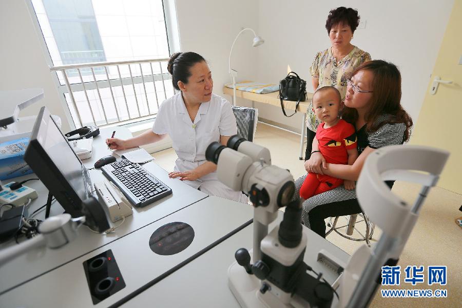 5月28日,医生在天津市第二儿童医院眼科诊室接诊。当日,新建成的天津市第二儿童医院试开诊,有着六十多年历史的天津市儿童医院门急诊同时关闭,天津市新老儿童医院顺利“交班”。该院位于天津市北辰区,占地120亩,建筑面积15万平方米,规划设计年门急诊量255万人次,设有床位1200个,是集医疗、科研、康复、预防为一体的现代化大型儿童疾病治疗中心。新院启用后,天津市儿童医院将进行改扩建,预计2017年重新投入使用。届时天津市将拥有两个各有侧重的儿科综合性医院,进一步优化儿科医疗资源配置布局。新华社发