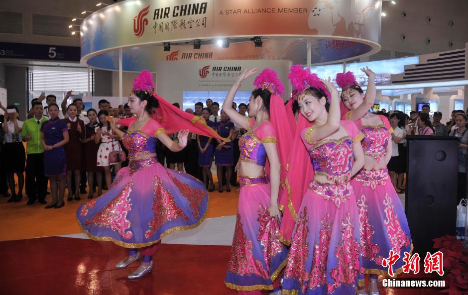 5月28日,渝洽会即将开幕,部分展馆已正式对外开放,国航、川航展馆的美女空姐和帅气空少跟随着音乐的节奏在展台上翩翩起舞展示各自才艺,吸引不少市民围观拍照。陈超 摄