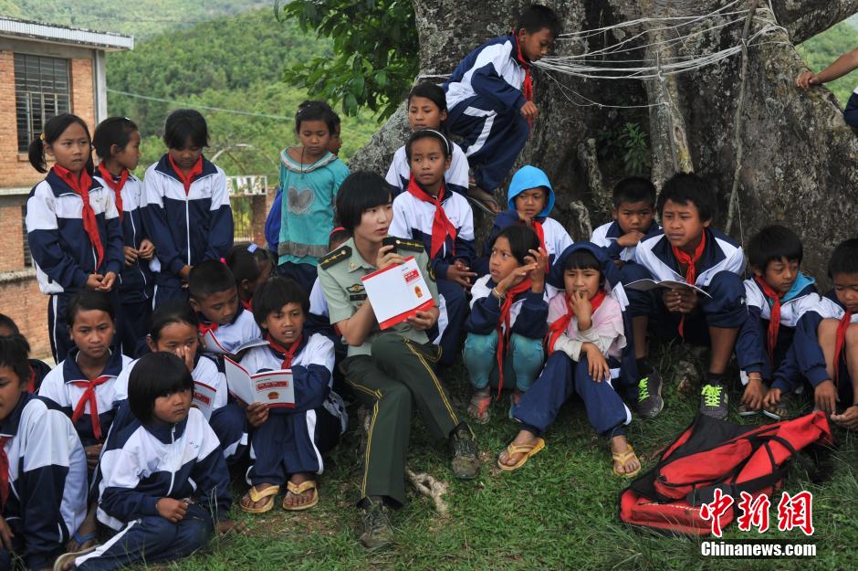 图为边防官兵向学生讲解毒品危害。中新社发 任东 摄
