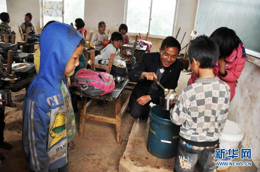 5月28日,谢毕华在给学生分发“营养餐”。新华社发(杨文斌 摄)图片来源:新华网
