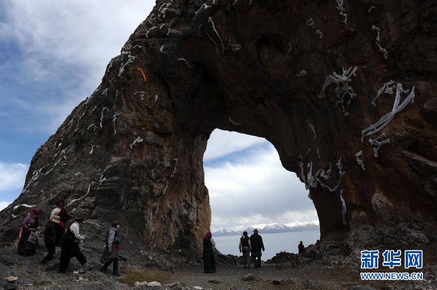 藏族群众在纳木错“圣象天门”景点转湖(5月20日摄)。随着天气回暖,西藏纳木错湖面已全面解冻,也进入了旅游旺季,很多游客来此领略壮阔的“天湖”美景。纳木错位于西藏羌塘草原南部,湖面海拔4722米,是世界上海拔最高的咸水湖,也是藏传佛教的圣湖之一。2014年,纳木错景区共接待国内外游客71万人次。新华社记者 唐召明 摄